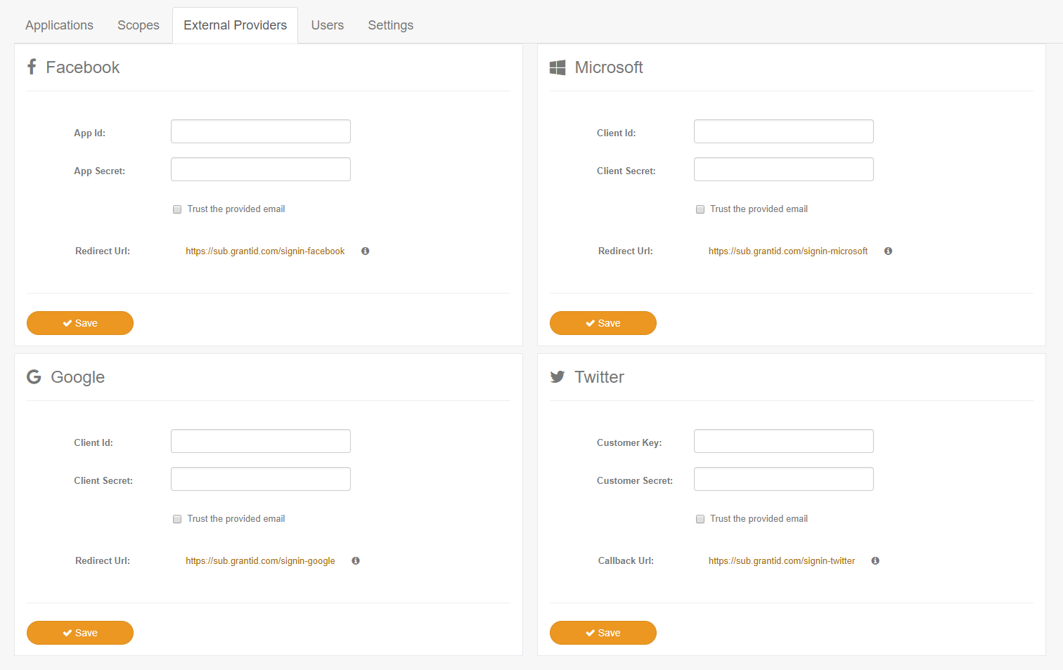 For each provider you may determine if you want to trust the provided email or not. If this option is selected, Prodesp GrantID will not request an email confirmation when registering a new user through that provider.