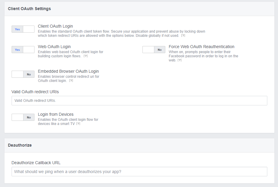 Fill the Valid OAuth redirect URIs with the Redirect URI provided by Prodesp GrantID External Provider's page, available in the Facebook panel, and select Save Changes.