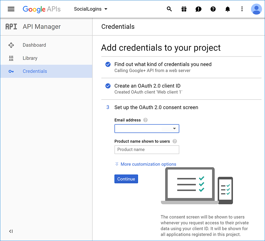 Now, you'll be asked to configure the Google consent screen. Fill the fields with your information and select Continue: