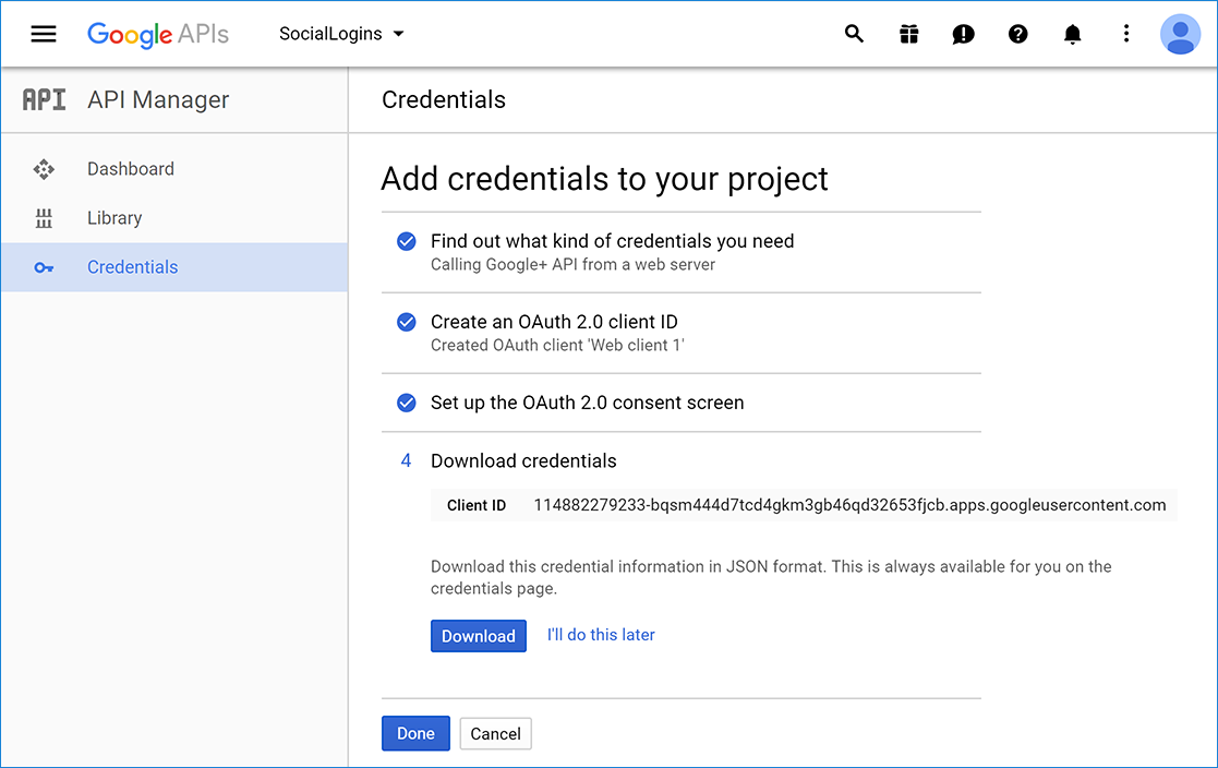 You've successfully generated your new Google credentials and will be redirected to the screen below. You don't need to download the credentials, so select Done: