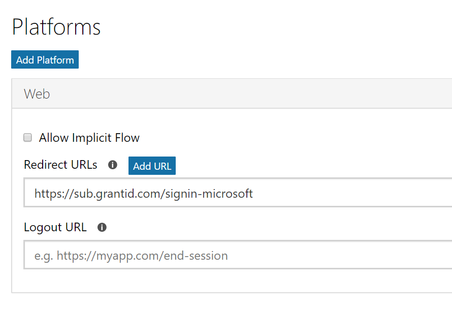 A new panel named Web will be created under the Platforms section. The Redirect URL is available in the Microsoft panel of the Prodesp GrantID External Provider's page.