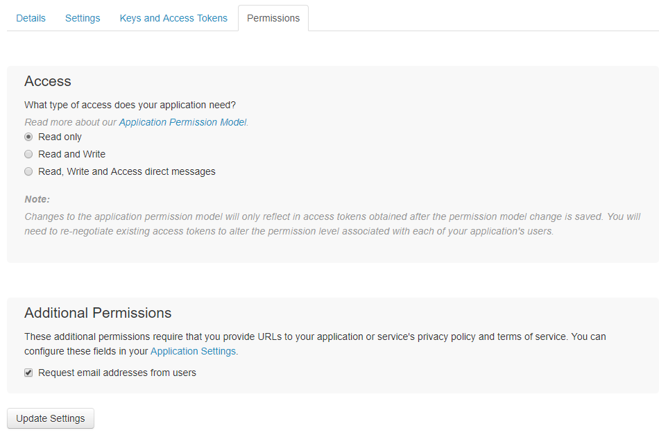 Now, select the Permissions tab and configure it as show below. Make sure the Request email addresses from users checkbox is checked: